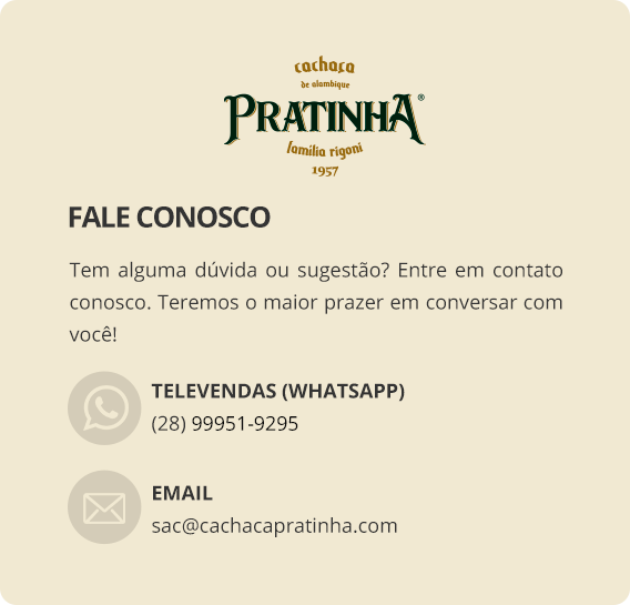 Falar de Cachaça Pratinha é falar exatamente sobre isso: Tradição, qualidade e muita história! Produzida desde 1957, no interior do Espírito Santo, hoje a Pratinha completa de 60 anos na busca pelo aperfeiçoamento de seus produtos. Um legado cultural e histórico em forma de bebida.